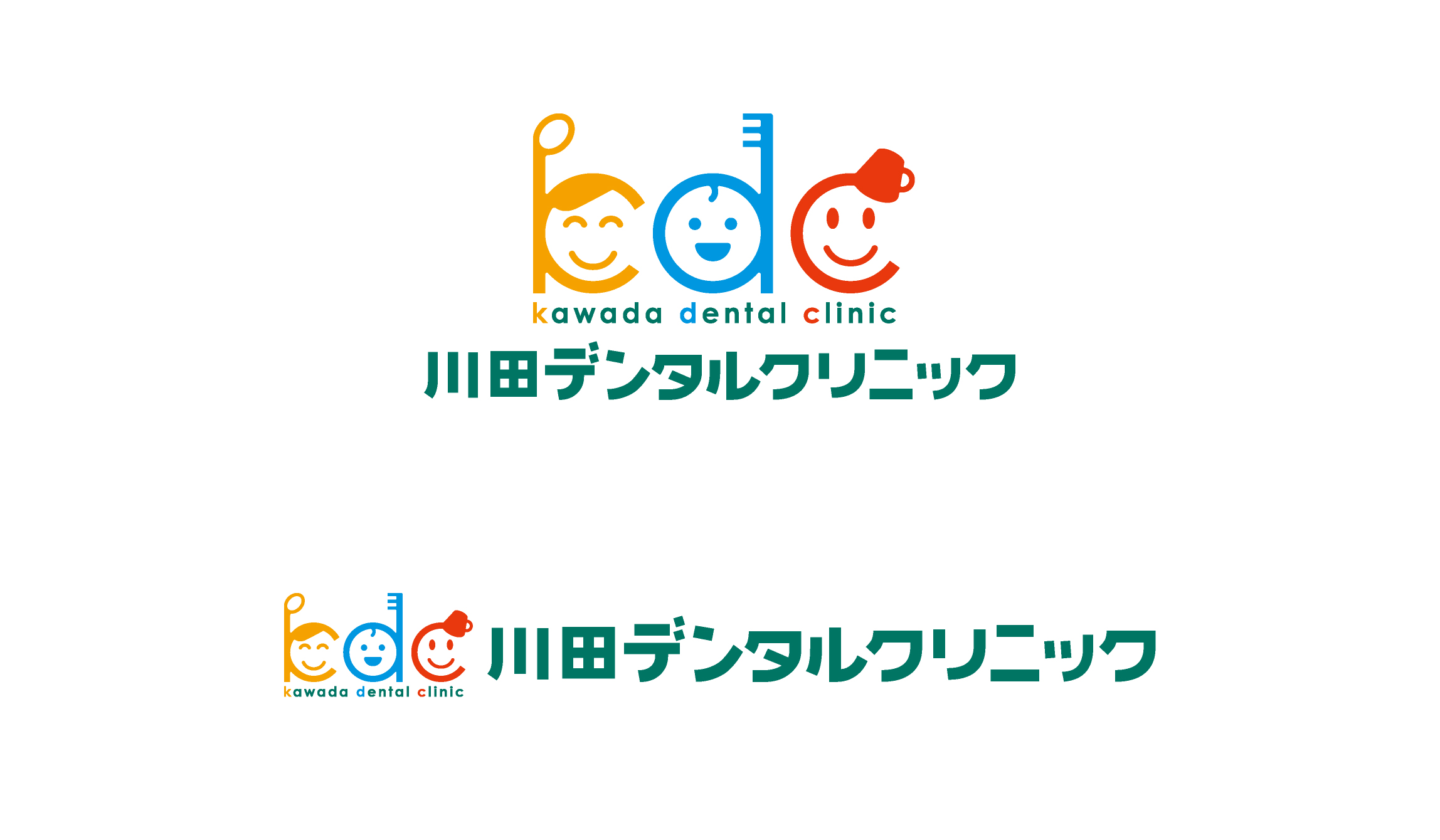 Kawada dental clinicの頭文字「kdc」を擬人化しました。 ぱっと見は3人の親子に見え、 よく見ると左から「K=デンタルミラーと歯科医」 中央は、「d=歯ブラシと子供」 その右は、「安心して子供を任せる母親」を表現しています。 「家族みんな」のかかりつけ歯医者さんという思いを込めました。